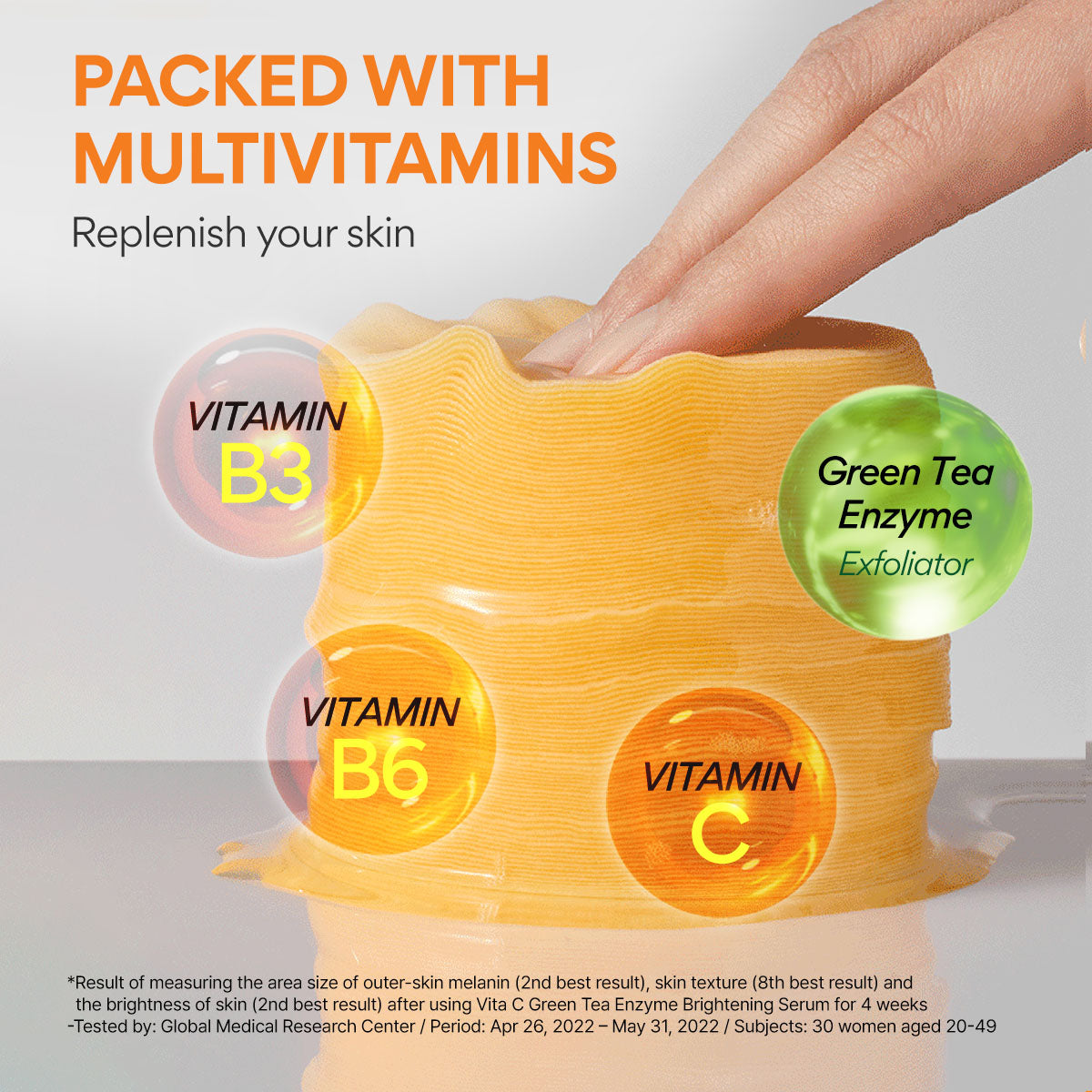 Contains 50,000PPM multi-vitamin and unique green tea enzyme to help with improving blemishes, skin tone, and skin glow.