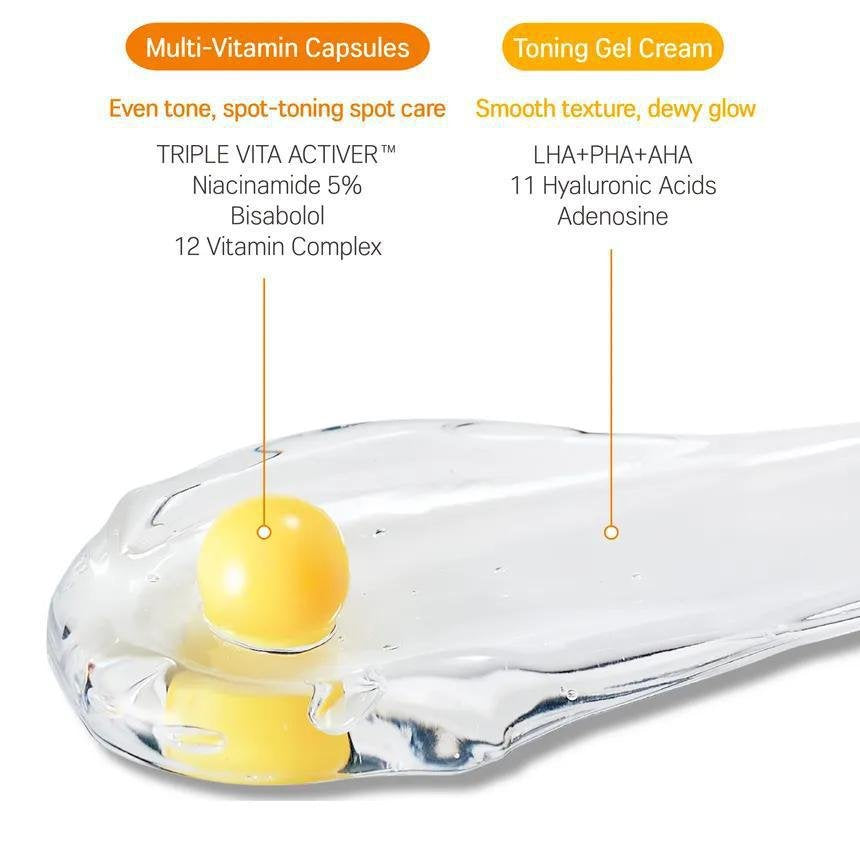 This cream is infused with a 12-type Vitamin Complex that helps improve the appearance of blemishes and freckles while absorbing easily into the skin.Formulated with Triple Vita Activer™—a blend of Hippophae Rhamnoides Water, 3-O-Ethyl Ascorbic Acid, and Hippophae Rhamnoides Fruit Extract—it delivers concentrated brightening care for clearer, more radiant skin.Enriched with LHA, PHA, AHA, Adenosine, and 11 types of Hyaluronic Acid, it helps smooth uneven texture and deeply moisturize, leaving the complexion healthier and more refined.Its soft, creamy texture ensures fast absorption without any greasy residue.