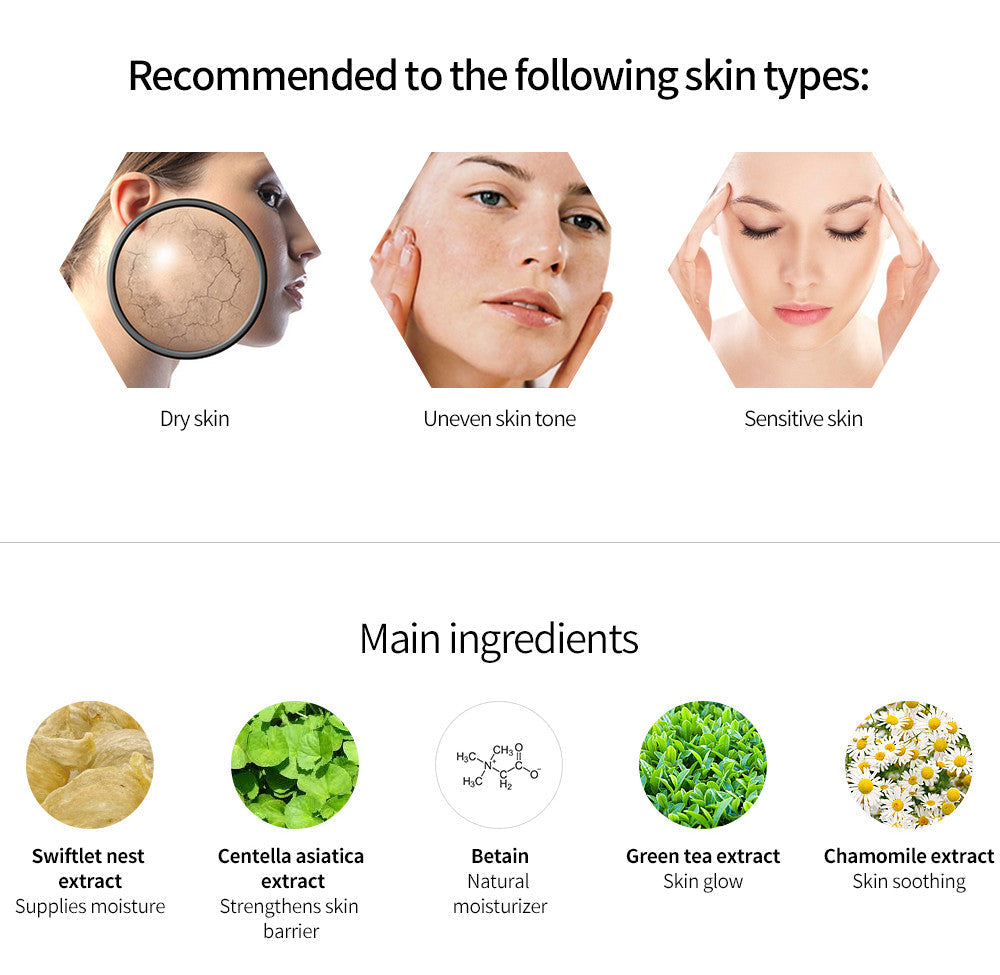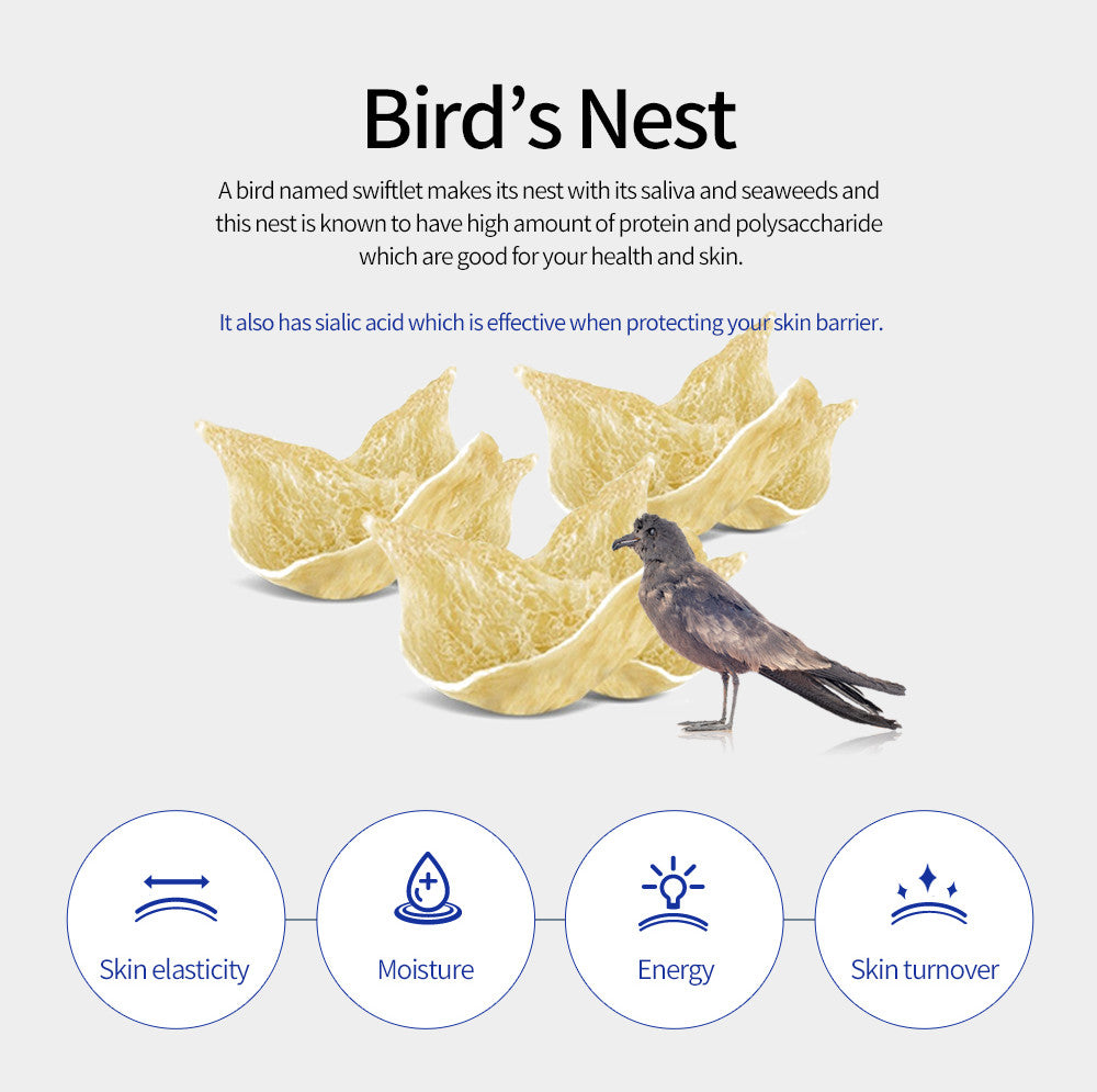 Contains 1000mg of bird's nest extract and hyaluronic acid to supply moisture to dry skin, and creates a thin coating film to protect skin.